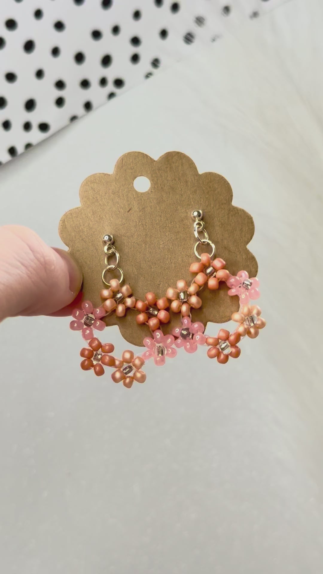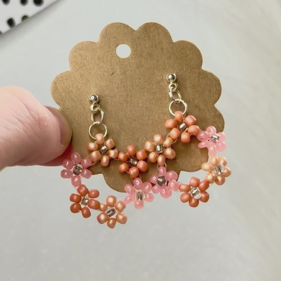 Delicate handmade beaded hoop earrings decorated with tiny orange flowers. These floral earrings are lightweight, feminine, and perfect for everyday wear or special occasions.