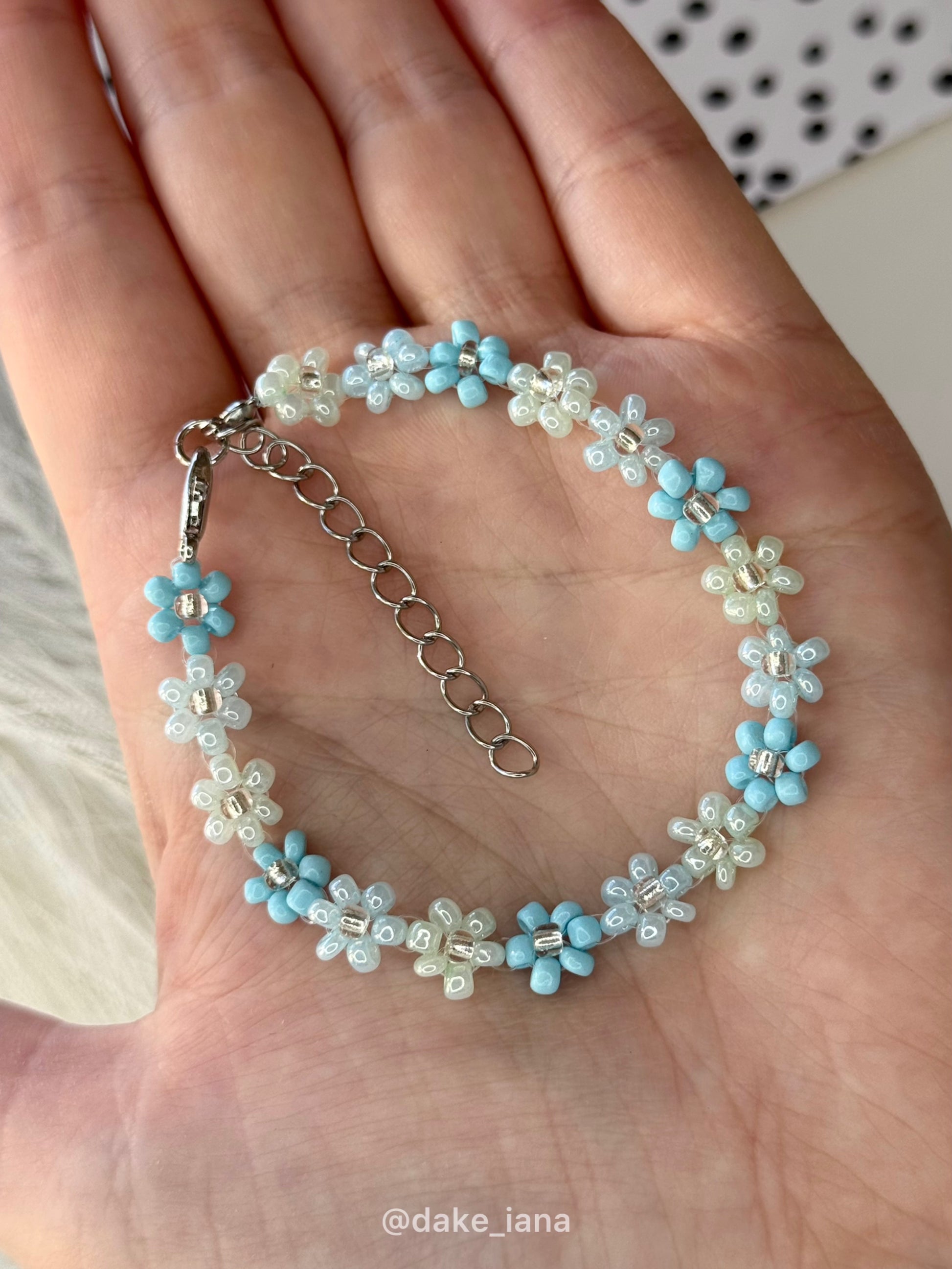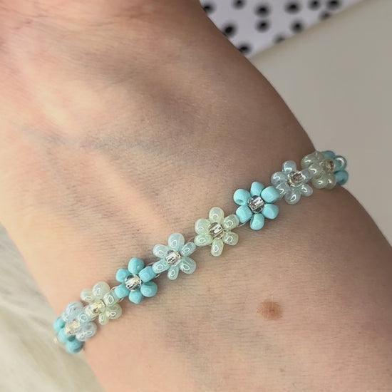 Delicate and feminine, this blue beaded flower bracelet is handmade with tiny glass seed beads shaped into charming floral motifs. Light, airy, and perfect for everyday wear or summer outfits.