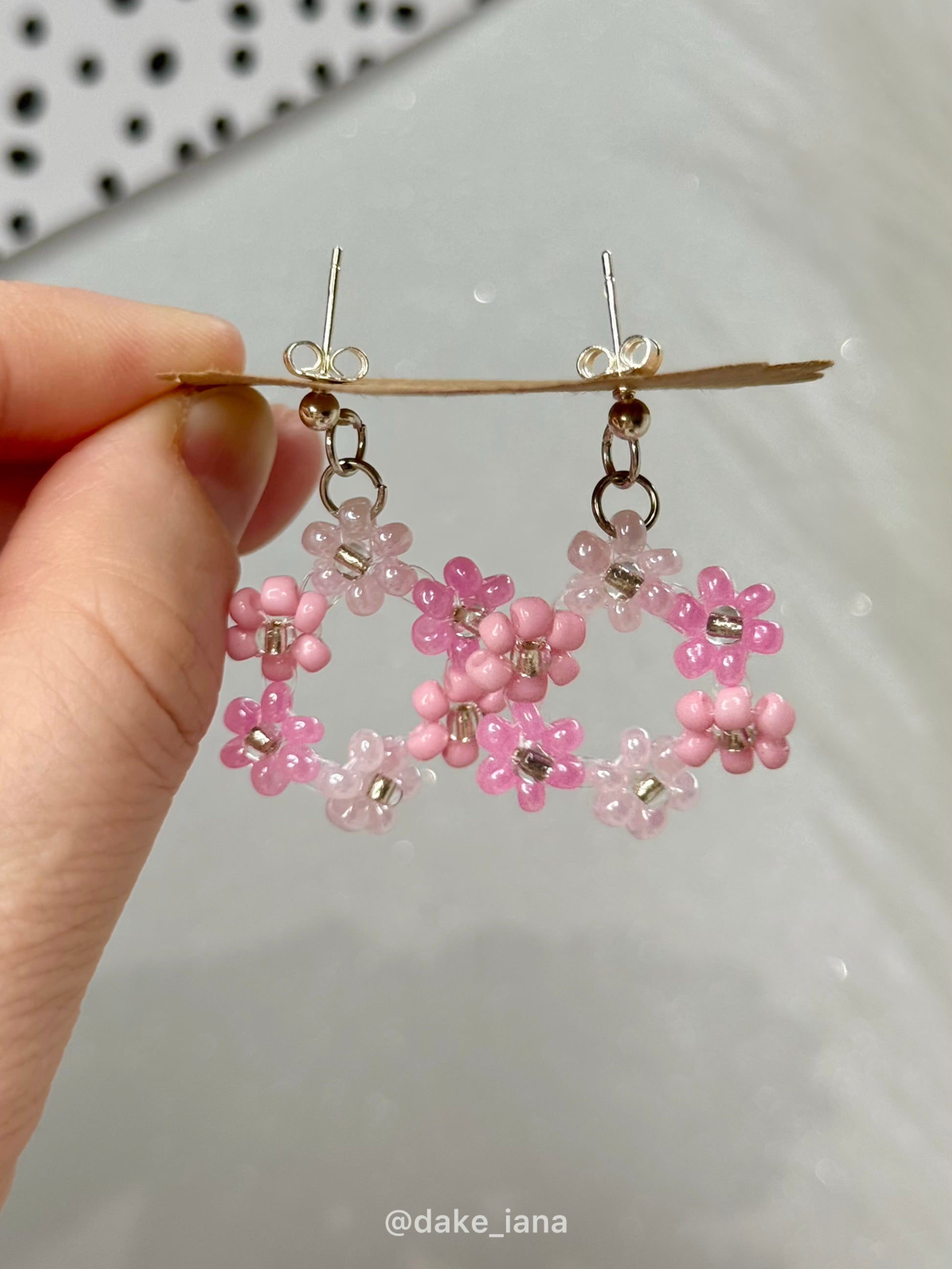 Delicate handmade beaded hoop earrings decorated with tiny pink
