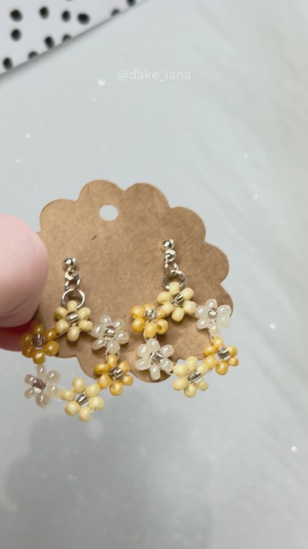 Delicate handmade beaded hoop earrings decorated with tiny yellow